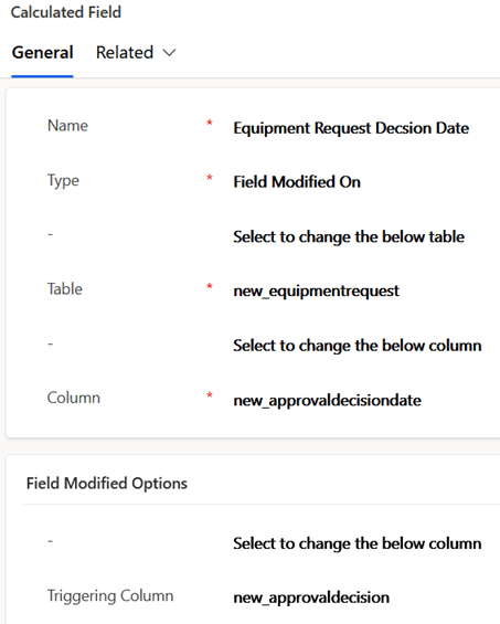 Creating a field modified on calculation only requires entering the type, and the table and column details in the first 2 sections. This example captures the date an approval decision is made on an equipment request record