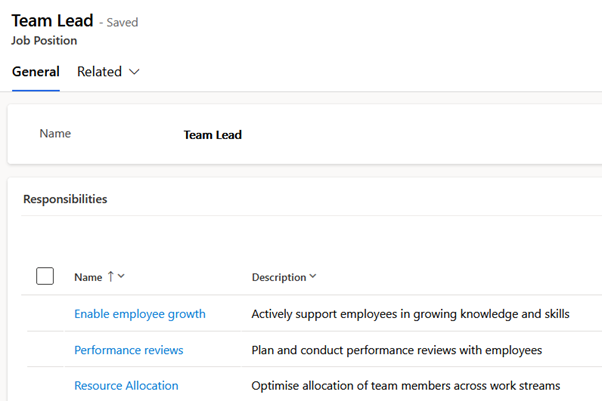 Having saved the quick create form, the team lead job position opens prepopulated with the desired job responsibilities