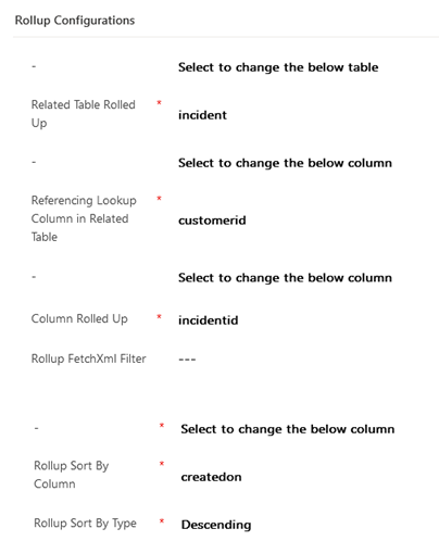 In the next section all remaining information required for the rollup is entered. Aside from the type and columns defining the rollup, an important aspect here is the rollup order. Specifically created on is ordered descending in the rollup to ensure the most recently created case is picked as the first result