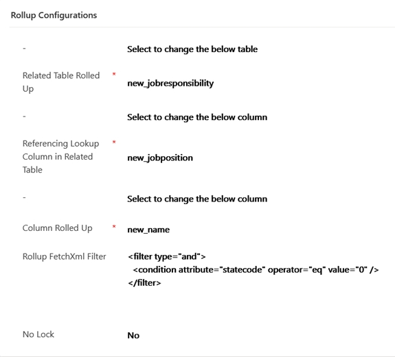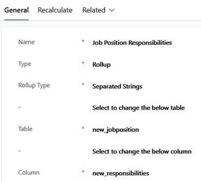 The next section has related table and relevant column information entered. For this example, the related table new_jobresponsibility links to the main table with a lookup column named new_jobposition, and the primary field in that table new_name is the one which will be populated into the rollup column