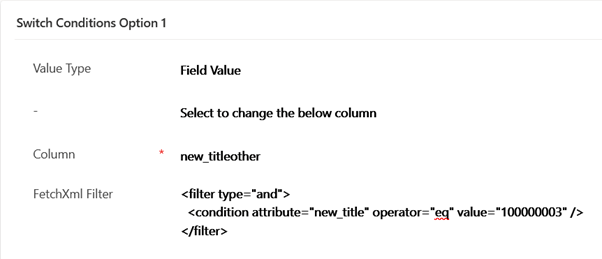The first switch condition states if other is selected then resolve the value to that in the other title field. For this example, 100000003 in the condition represents the value for the other option in the picklist