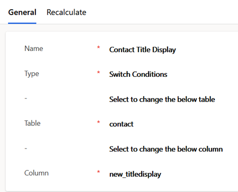 To create a calculated field of type concatenate, enter the type, table, and column to auto-populate. in the first general section. This example will populate a field title display with the title selected from a picklist, unless other is selected in which case a different string field for a custom title