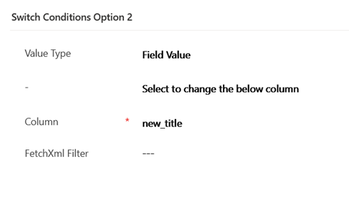 Each FetchXml filter switch is paired with a value for when it is the matching result. Value types have the flexibility of being either another column, an explicit value, the modified-on date, the modified by user, or simply clearing out the value