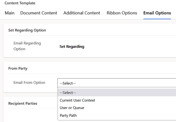 - Party Path – a token is defined as the from party. This option uses the same token types as content tokens and can be either a field token to pull the sender from the source record context, or a first token to pull from a settings record. The value resolved by the token should be queue or user record which has an approved mailbox for sending emails