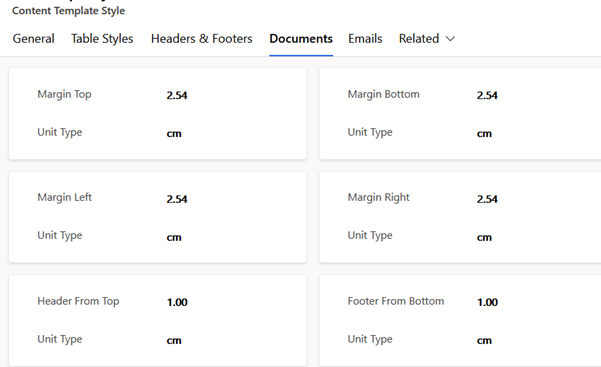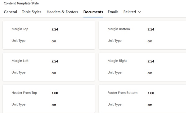 The documents tab of the content templates style form includes options to adjust page margins, and header spacing of documents