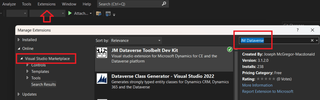 The screenshot below shows installation in the Extensions and Updates dialog. Select Visual Studio Marketplace and search for JM Dataverse Toolbelt