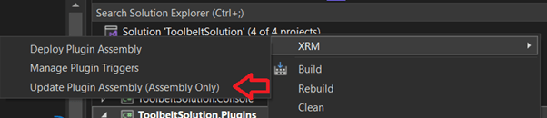 The Update Plugin Assembly button is made available in the XRM menu when a project is right-clicked in solution explorer