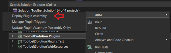The Deploy Plugin Assembly button is made available in the XRM menu when a project is right-clicked in solution explorer