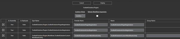 - Refresh Workflow Arguments – if ticket the deployment process will set a field on each Plugin Type already deployed intended to refresh all Input and Output Argumenta based on the updated assembly classes. If not ticked where Input and Output arguments have changed the Plugin Types may not update adequately