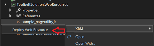The Deploy Web Resource button is made available when a compatible file type is right clicked in solution explorer