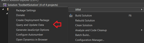 To run the query dialog right click the solution and select Query and Update Data in the XRM menu