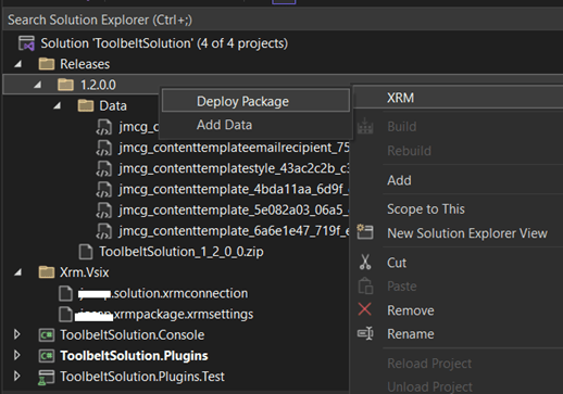 - Create Release Package – this will export a solution from the active connection into a solution zip file. Configuration data may optionally be included and saved as XML files in a release subfolder