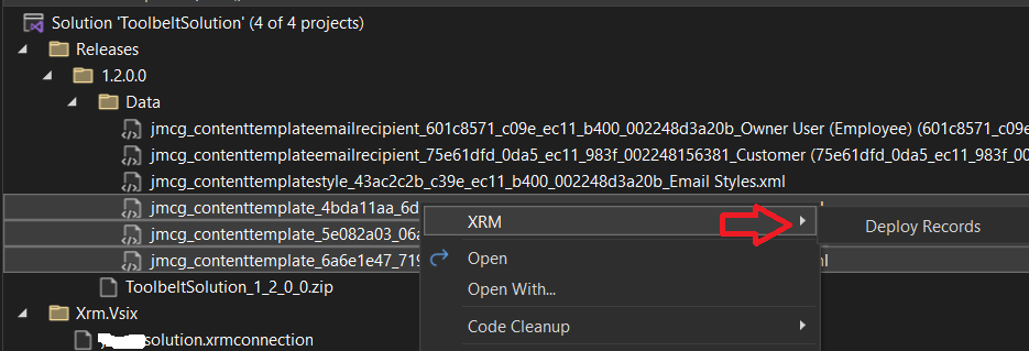 To run Deploy Records select one or more records in the Data folder of a release package and select Deploy records in the XRM menu