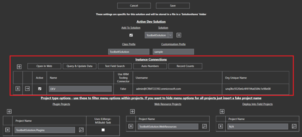 The Dev Kit allows multiple instance connections to be saved in the package settings for a visual studio solution