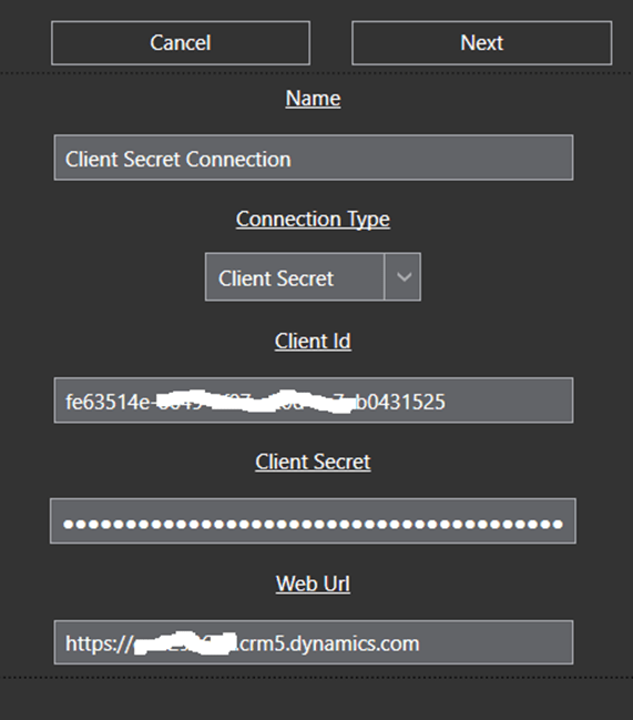 To create a client secret connection saved and encrypted by the app, select the Connection Type as Client Secret